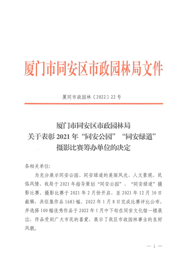 2022.2.18廈門市同安區(qū)市政園林局關(guān)于表彰2021年“同安公園”“同安綠道”攝影比賽籌辦單位的決定